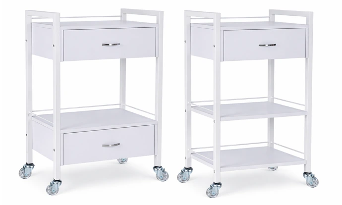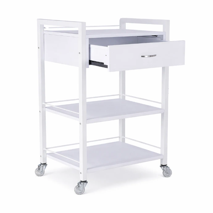 Fitted with robust, easy-rolling castor wheels designed for effortless movement across salon and clinic floors. The durable construction provides reliable support and stability while allowing the trolley to move freely around your space with minimal effort.