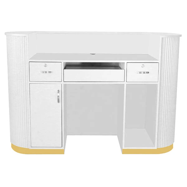 Designed to anchor the front of your salon with confidence and style, the Pallas 1600 Salon Reception Desk is a statement piece that blends refined aesthetics with everyday practicality. Its streamlined silhouette and subtle gold trim at the base create a polished, contemporary look suited to high end salon and clinic spaces.